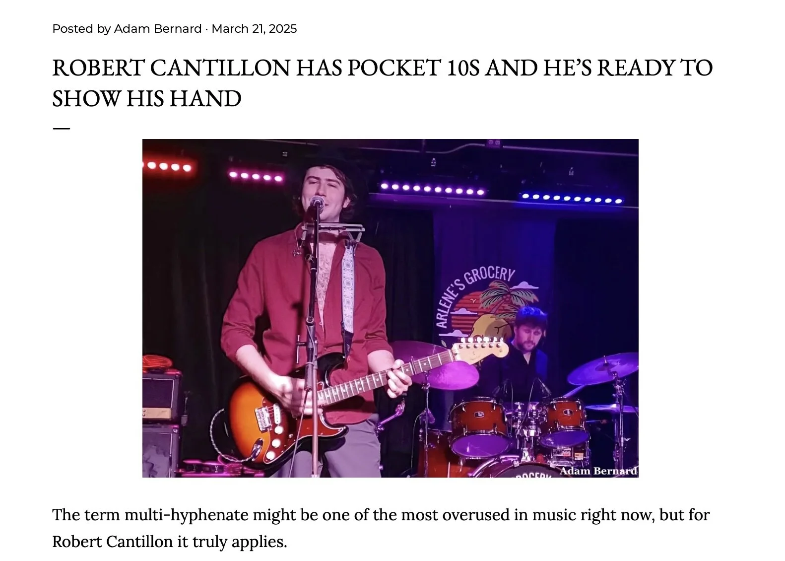 As a musician, Robert began playing the guitar over a decade ago, and hasn’t gone a day since without picking it up. In New York, he is band leader and frontman of Rob Cantillon & the Pocket 10s, a rock band which performs his original songs alongside classic covers ranging from Tom Petty to Billie Eilish. The band has performed at such illustrious small venues as The Bowery Electric, The Delancey, Pete’s Candy Store, Connolly’s Pub, and Berlin Under A, to name a few, and has to date released two singles, both in 2023: ‘Got To Get Away’ and ‘Going Postal’.